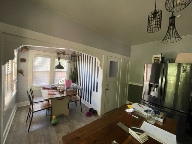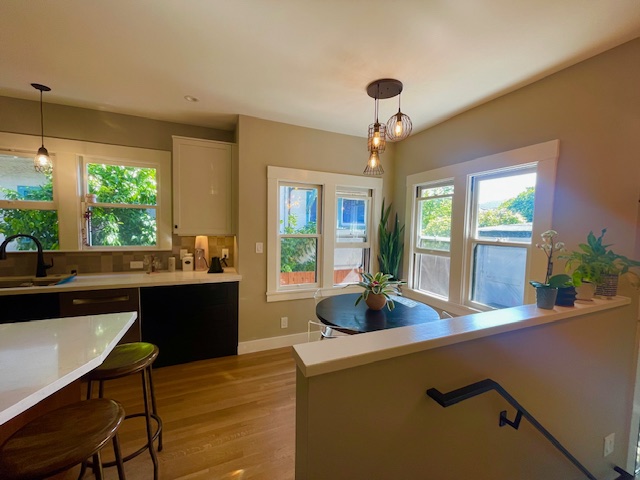 This Kitchen seemed small, dark and cramped. Removing a non load bearing wall to stairs gave 3′ of breathing room at the table and a wall of tall cabinets allows ample storage, making this an incredibly efficient kitchen.